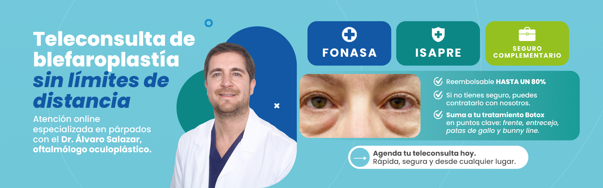"Estoy muy contenta con la cirugía que realizó el doctor Álvaro Salazar. Me siento bien al 100%. Recomiendo las manos mágicas del doctor, ya que no se siente nada de dolor y volvería a hacerme otra cirugía. El doctor me dejó muy conforme y feliz con el resultado. Recomendado para realizarse una cirugía de párpados."